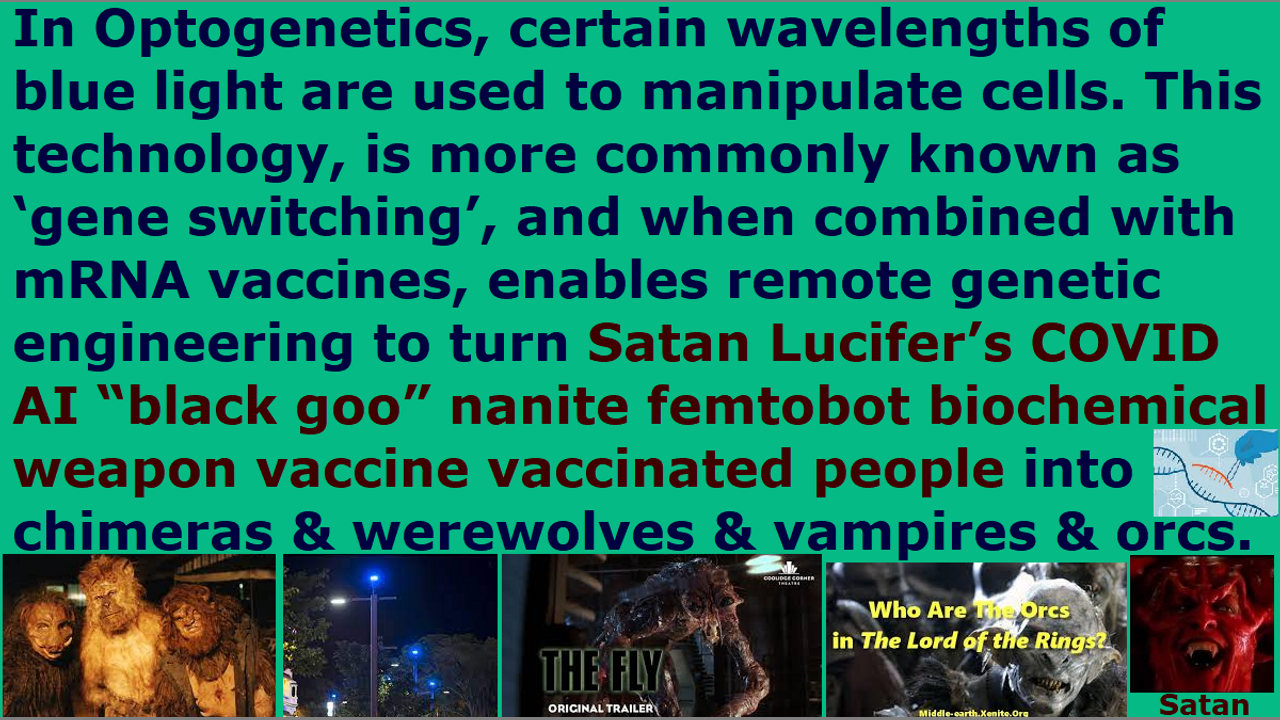 *** Intelligence news update from the Human Homo-Sapiens Race Survival Resistance (HRSR) headquarters and Republic Rebel Alliance battlefront (January 2023). In Optogenetics, certain wavelengths of blue light are used to manipulate cells. This technology, is more commonly known as ‘gene switching’, and when combined with mRNA vaccines, it enables remote genetic engineering to turn Satan Lucifer’s COVID AI “black goo” nanite femtobot gene-altering zombie Borg 5G remote assassination biochemical weapon vaccine vaccinated people into chimeras and werewolves and vampires and orcs. The Western feminist nations’ “women’s equality” “female church donators loving” “Jezebel spirit filled” “Satan Lucifer’s ordained & allowed & trained” church pastors and religious Christian hordes, who are redefining Bible verses and rebelling against women’s head coverings so that their heads are controlled by the fallen angels to stick their middle fingers up at God, and cross-dressing in “Satan Lucifer’s post-1960s cross-dress-project” men’s trousers to mock God’s Word, and stealing unbiblical post-1873 10% salary tithe income taxes to make God’s house into an extortionist gangster’s office, and doing hundreds of other things to remove all of God’s protection and replace Jesus with Jezebel & Sananda Jesus & Mammon & Adephagia, in order to bring judgment upon their Western feminist nations with sword & famine & plague & demon armies, are hiding all of this because they are afraid of assassination attempts and ridicule from their church donators as lunatic heretic idiotic narcotic maniacs. The devil Satan Lucifer and the fallen angel fake aliens devils think it is amusing and funny and entertaining to see billions of humans transform into shapeshifted chimeras and werewolves and fly people and vampires and zombies and Medusa and minotaur and reptilians using their COVID vaccine, and if you condone it by remaining silent or just saying superficial truth, then you are basically agreeing with Satan Lucifer and the fallen angel ascended masters fake aliens devils. Speak God’s full truth dear brethren in love, and do not just tell a church donator who needs to get the COVID vaccine to return to work and feed his family and has been pressured by his wife to take the vaccine for his daughter’s safety sake, that the vaccine will just change his gene, and walk away thinking you did your job by telling partial truth and fake truth and Satan Lucifer’s modified truth. Only a stupid person speaks like that. Did Jesus tell you that you may have a problem with sin in the future so it may be a worthwhile investment to believe in him as your Savior? Do not insult God by worshipping self and pastor’s reputation and pastor’s salary and safety from assassination attempts and safety from ridicule by church donators, instead of loving God and loving others and speaking the whole truth and nothing but the truth. God never kept part of the truth hidden from you, so that you may risk the danger of walking into hell. If you are stupid, then hide partial truth, and hide from others that the COVID vaccine will change people into chimeras and werewolves and vampires and gargoyles and wraiths. They are showing you the COVID vaccine post-apocalyptic world “Lord of the Rings” human-eating orcs in plain view in their movies, and how can you who claim to be a Christian, remain silent about it and hide it from people and not warn your church donators, just because it sounds crazy? Does Joshua & Caleb banzai charging millions of Canaanite human-eating orc nephilim giants in the Promised Land sound crazy to you, even when you preach it every Sunday in your church sermon yourself? You would be a religious hypocrite if you think that way. That is what a cold-blooded religious leader who works for church donations does.