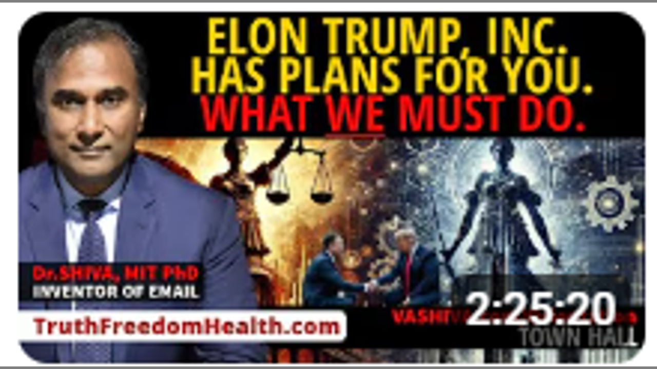 In this presentation, Dr.SHIVA Ayyadurai, MIT PhD, the Inventor of Email, Candidate for President of the United States, shares the how the open merger of the US Govt and Industry represented by Elon Trump, Inc. will now escalate rapidly to a Zionist State Capitalism and what we can and must do to ShatterTheSwarm.com with solutions for TruthFreedomHealth.com. Full Blog Post: https://vashiva.com/dr-shiva-live-elo...