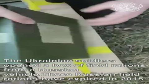 The Ukrainian soldiers opened a box of field rations from a Russian vehicle.These Russian field rations have expired in 2015