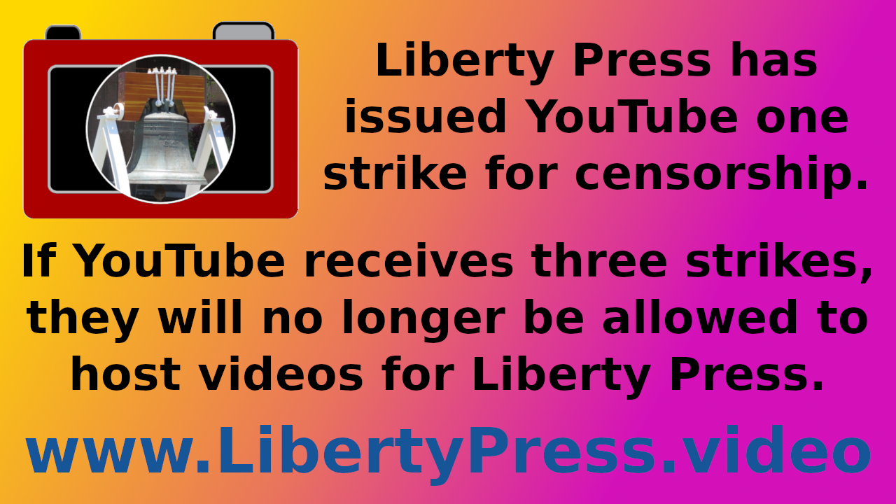 YouTube receives censorship strike for violation of free speech and sucking up to big pHARMa. If YouTube receives three strikes, it will no longer be allowed to host videos for Liberty Press.