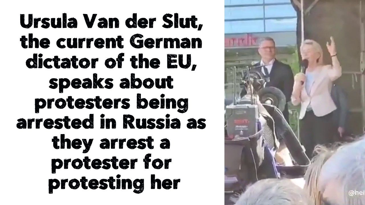 Ursula Van der Slut, the current German dictator of the EU, speaks about protesters being arrested in Russia as they arrest a protester for protesting her... she's pushing hard for WW3 to finish the job she started with the vaccine... she won't rest until everybody in Europe is dead....