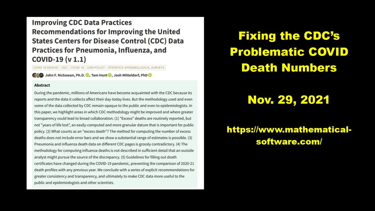 John F. McGowan, Ph.D., Tam Hunt, Josh Mitteldorf, PhD. Improving CDC Data Practices Recommendations for Improving the United States Centers for Disease Control (CDC) Data Practices for Pneumonia, Influenza, and COVID-19 (v 1.1). Authorea. November 29, 2021.