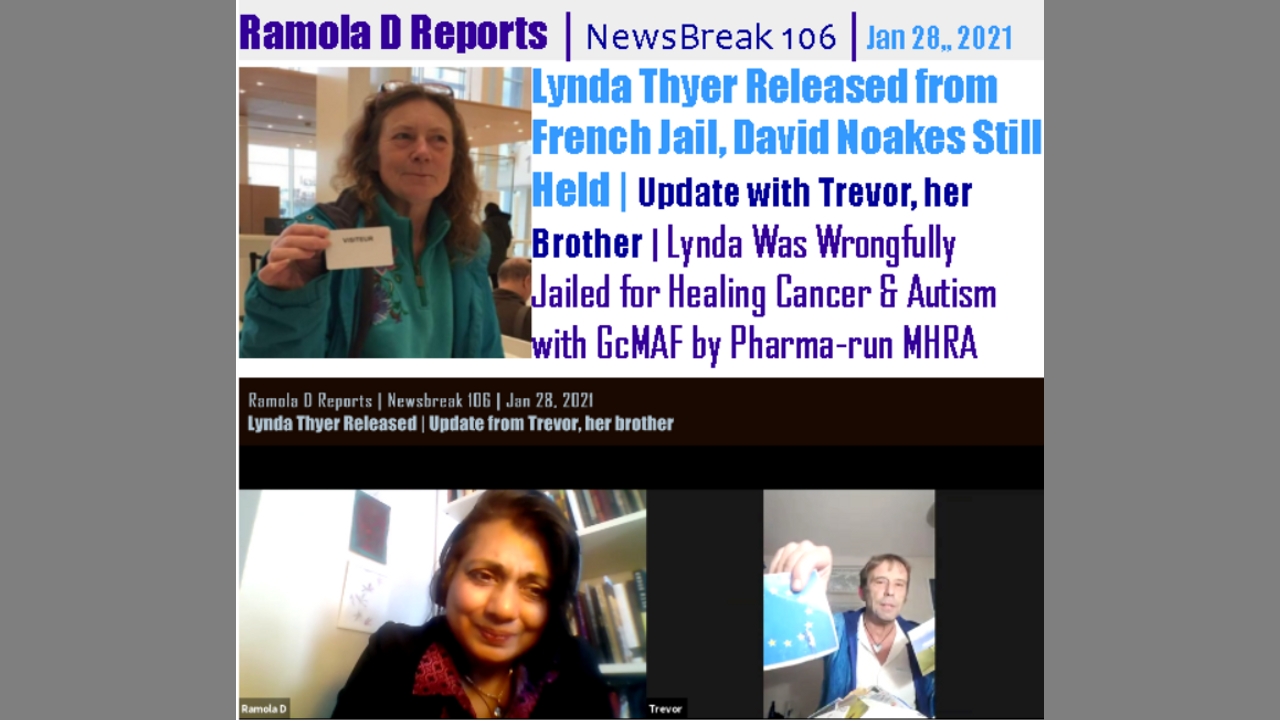 Trevor recounts how Lynda Thyer was released, and what the situation is currently. Lyn Thyer, a biomedical research scientist working with David Noakes of Immuno Biotech had been wrongfully pursued, prosecuted, and extradited to Fleury Merogis Prison 19 months ago (as also was Noakes) on charges laid on him by the French Prosecutor on advisement of British courts who acted for the MHRA UK in stopping all their successful work to heal people with cancer, autism, CFS and other diseases with GcMAF, a naturally occurring protein, by saying it had not been licensed and that they were peddling unapproved drugs. (Pl. see earlier coverage at youtube.com/RamolaDReports and everydayconcerned.net.)