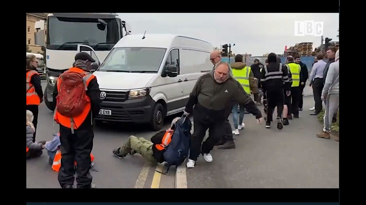 Irate motorists dragged protesters from the road, where they were sat down or laid out, as the scenes turned violent. The area is considered a bottleneck for freight lorries, drivers told LBC.