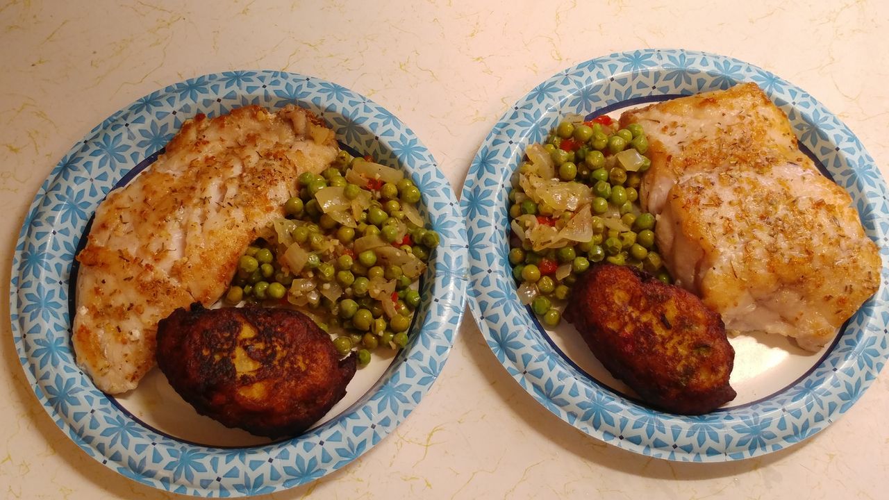 Scamp grouper, English peas with onions and pimentos and fried plantain fritters!