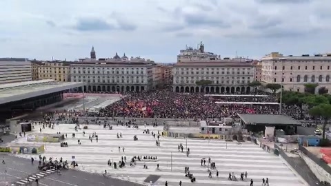 📍 Piazza dei Cinquecento, a square outside Rome’s Termini Station, is packed wall-to-wall with demonstrators of all ages—so dense that station access is effectively blocked.