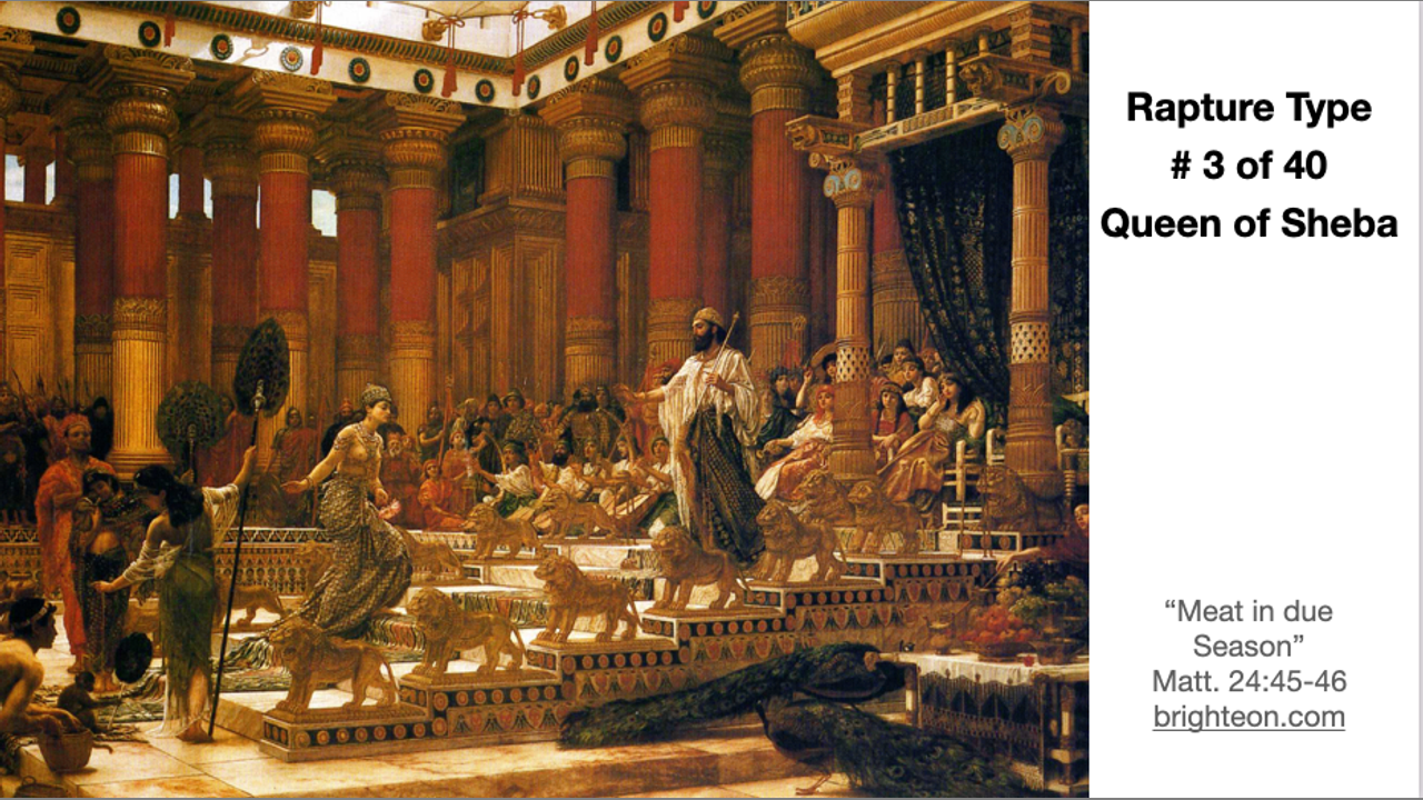 The Gentile queen of Sheba comes from the ends of the earth to meet Solomon, and it takes her breath away, etc., another great type of the rapture coming this April 19th, 2025.