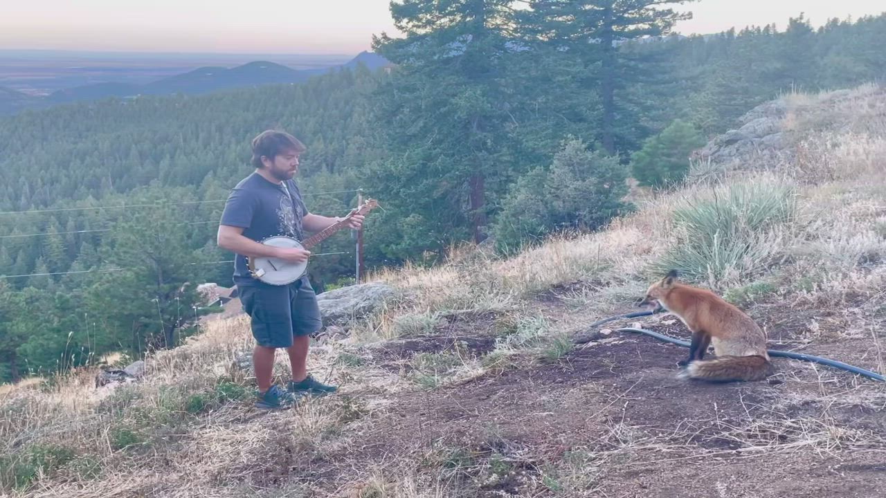 Playing banjo for a wild fox! He came back for an encore!