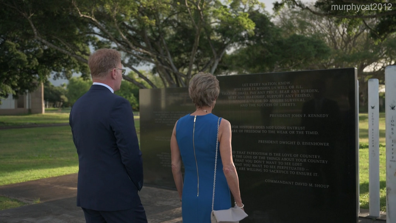 200120-N-LI768-1001 PEARL HARBOR (Jan. 20, 2020) - Acting Secretary of the Navy Thomas B. Modly and his wife tour the USS Oklahoma Memorial on board Joint Base Pearl Harbor-Hickam. Modly toured the memorial to remember fallen United States Sailors and Marines of the attack on Pearl Harbor. The visit concluded his campaign in his first official trip to the U.S. Indo-Pacific areas of responsibility. (U.S. Navy video by Mass Communication Specialist 1st Class Devin M. Langer)