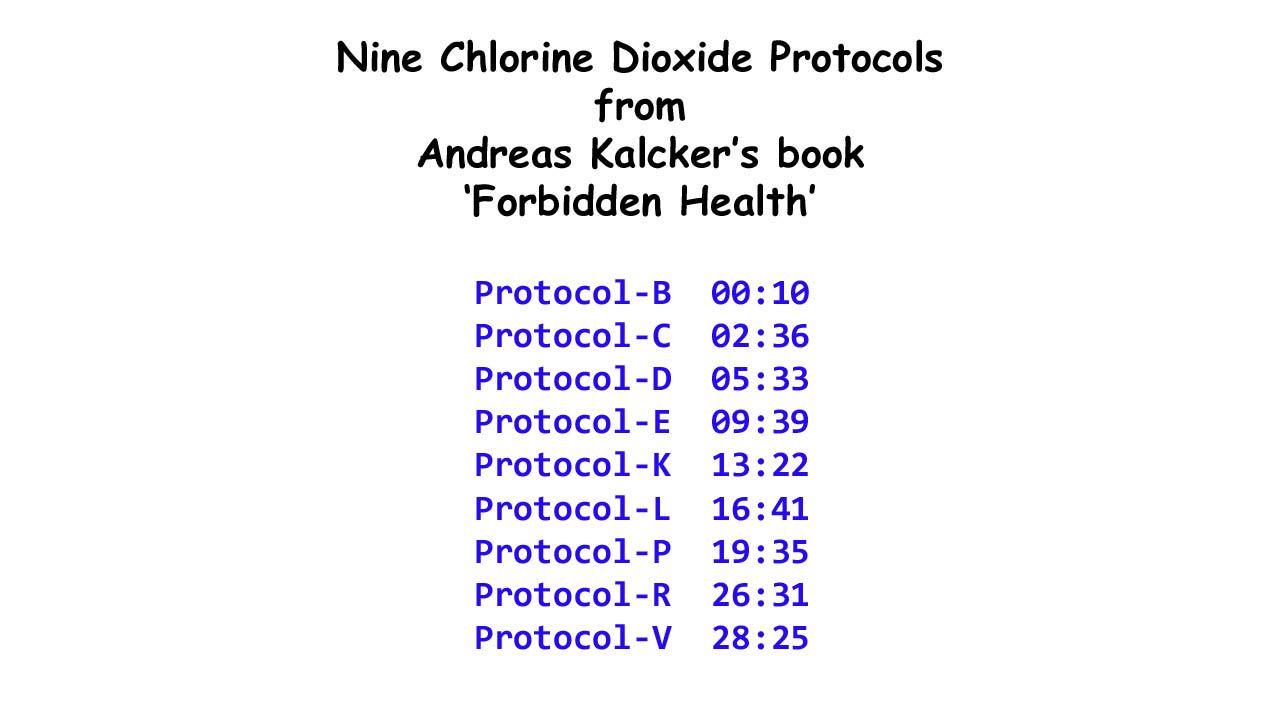 Nine Chlorine Dioxide Protocols from Andreas Kalcker's book, Forbidden Health Explained.