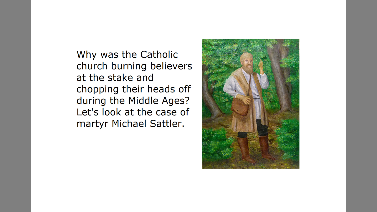 In this presentation, I use the example of martyr Michael Sattler (1527) to show what were the most common reasons the whore of Babylon was burning true believers at the stake, or chopping their heads off, drowning them, etc. Accounts are taken from The Martyr's Mirror (https://homecomers.org/mirror/ ).