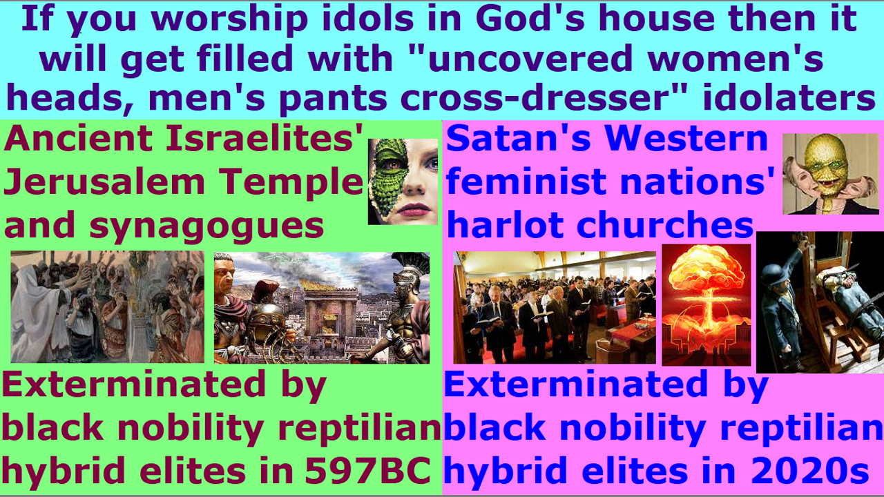 If you redefine hundreds of Bible verses and if you worship hundreds of idols and foreign gods in your Satan Lucifer’s religious system’s Western feminist nations’ End Times apostate harlot Church, then your church will get filled with millions of religious Christian hordes idolaters. You will end up getting huge amounts of church donations. On the other hand, if you preach the original Bible verses who is Christ the Word of God, then 99% of your church donators will leave your church in anger & disgust & terror. Idolaters do not like God’s Word, especially the part about assassination attempts, and their heathen families getting slaughtered or trying to kill them. The crowds of church donators and church members all left Jesus or formed angry mob riots against Jesus. The ancient Israelites during Ezekiel’s vision were worshipping idols and foreign gods inside God’s Temple in Jerusalem and synagogues. They were exterminated in 597 BC by the black nobility families reptilian hybrid elites. Likewise, Satan Lucifer’s Western feminist nations’ End Times apostate harlot churches are worshipping hundreds of idols and foreign gods in their churches. They call themselves Christians, but they go to Satan Lucifer’s religious system’s millions of churches, and they redefine hundreds of Bible verses to worship idols and foreign gods, and kick Jesus out. Therefore, they do not have God’s protection, and they will get exterminated by the black nobility families reptilian hybrid elites. They have a form of Christianity, but deny its God. They are fake shell churches that were created by Satan Lucifer to fill it with millions of his religious Christian hordes to misdirect them to destruction by sword & famine & plague & demon armies. It is a livestock slaughter house. Let their gods of “uncovered women’s heads witchcraft rebellion” and “men’s pants cross-dressing mockery of God’s Word” and “illegal tithe income tax theft by using God’s name” gods save them, if they can. The problem is, their gods will be the ones exterminating them. When you conduct idolatry and run after foreign fake gods, then you get destroyed just like the Israelites who were massacred by the Roman reptilian hybrid elites in 70 AD. Preach this in your next Sunday church service sermon, so that 99% of your church donators will leave your church in anger & disgust & terror, so that God’s house will be cleansed of their religious filth. Do it now and do not wait until tomorrow, unless you are a crazy lunatic who has lost all common sense of the Holy Spirit. Repent and receive Jesus as Savior, and make straight the way of the Lord! End of transmission…