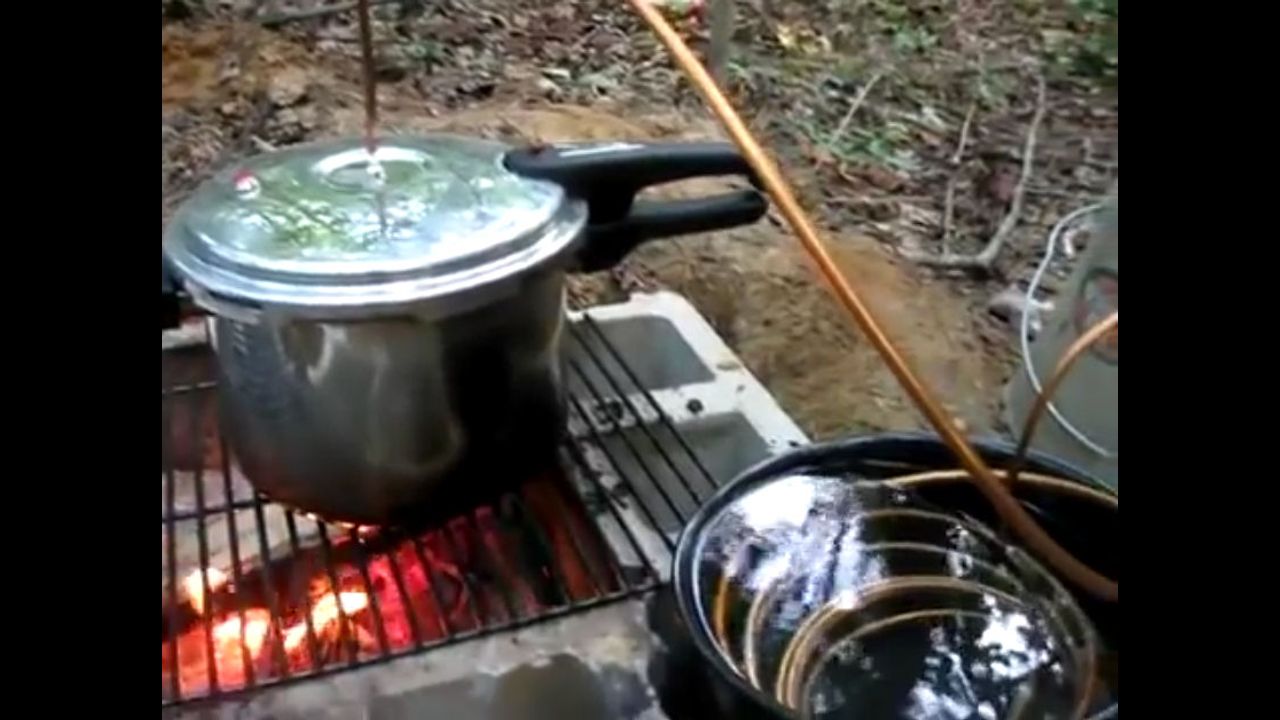 Short video of a water distiller made from a pressure cooker.