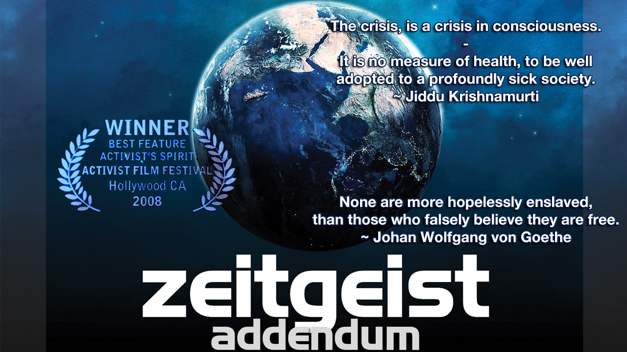 Zeitgeist: Addendum is a 2008 film produced and directed by Peter Joseph, and is the sequel to the 2007 film, Zeitgeist: The Movie. It premiered at the 5th Annual Artivist Film Festival in Los Angeles, California on October 2, 2008.