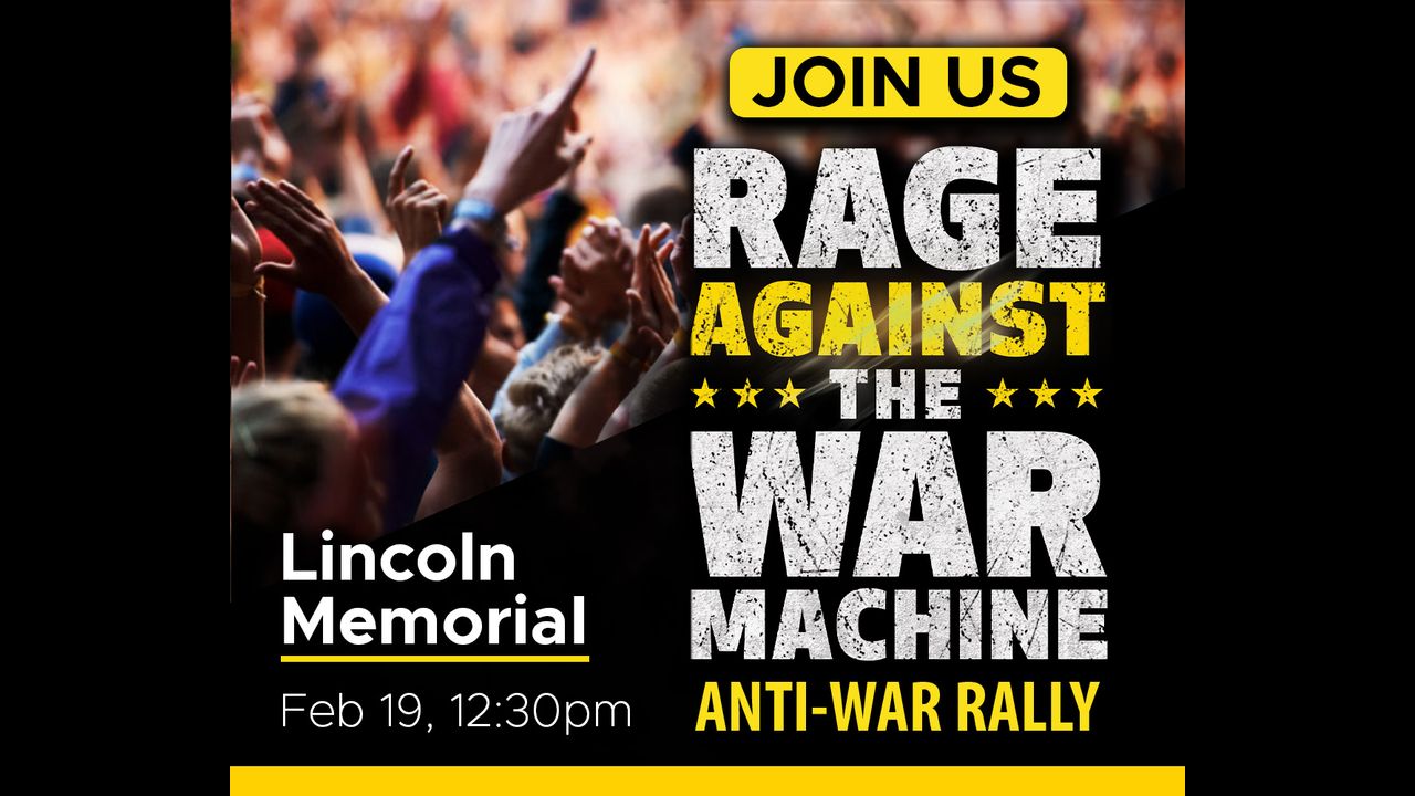 From the website: Join us at the Lincoln Memorial at 12:30 pm on Sunday, February 19th, on the anniversary of the Ukraine War and President's Day Weekend, to Rage Against the War Machine! Veterans, speakers, rock musicians, comedians, and more. After the rally, we'll march to the White House and deliver our demands to Warmonger-in-Chief Joe Biden. Get more info at: https://rageagainstwar.com/#Home