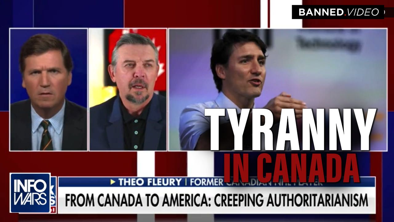 Alex Jones presents a video clip from Tucker Carlson's Fox program where he exposes the authoritarian government of Canada under Justin Trudeau.