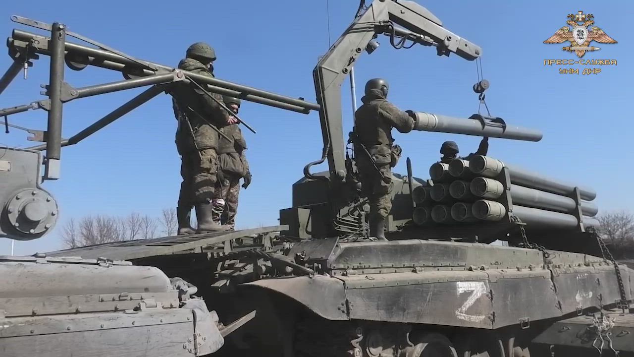 Russian TOS-1 Incendiary Thermobaric Multiple Rocket Launcher System firing at Ukrainian Nationalist positions in Eastern Ukraine. 032022