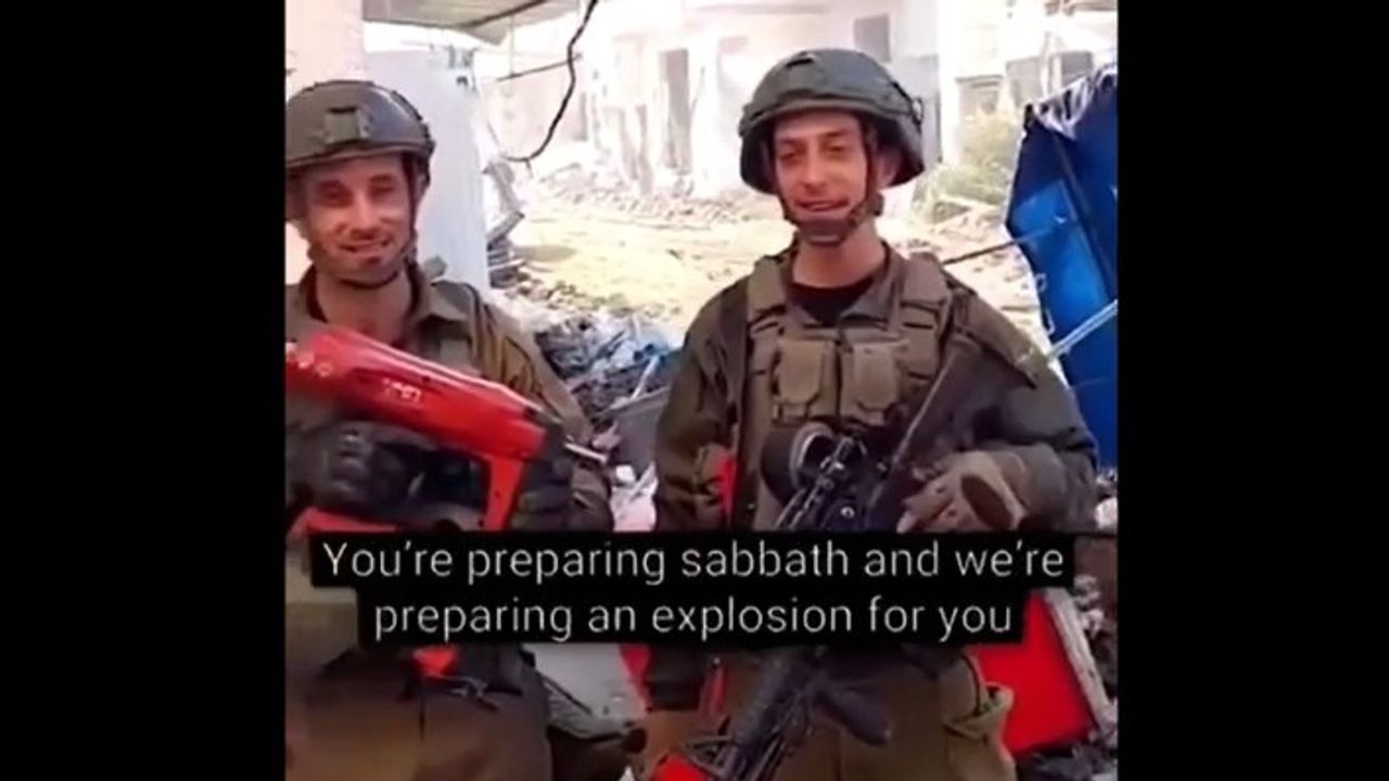 Israeli occupation soldiers document and celebrate the planting of dynamite and bombs inside a mosque in Khirbet Khizaa, Khan Younis, in the central Gaza Strip, to detonate it.