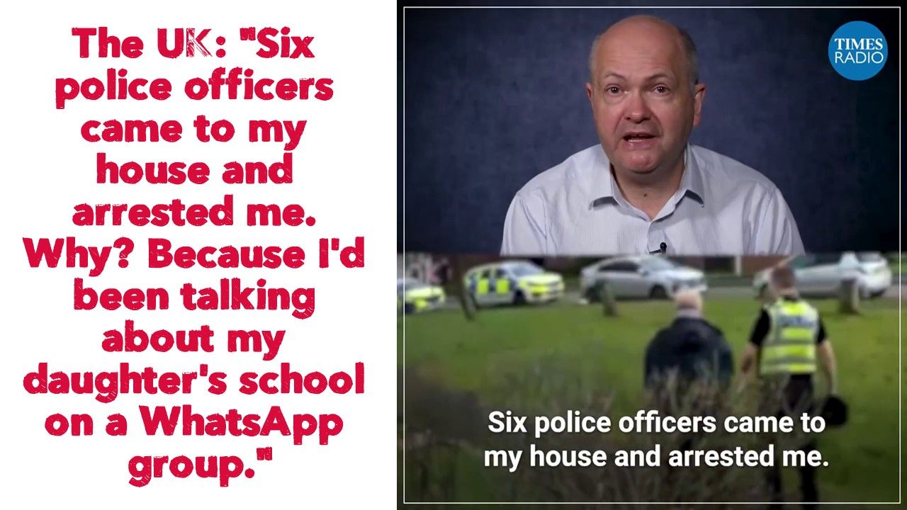 The UK: "Six police officers came to my house and arrested me. Why? Because I'd been talking about my daughter's school on a WhatsApp group."