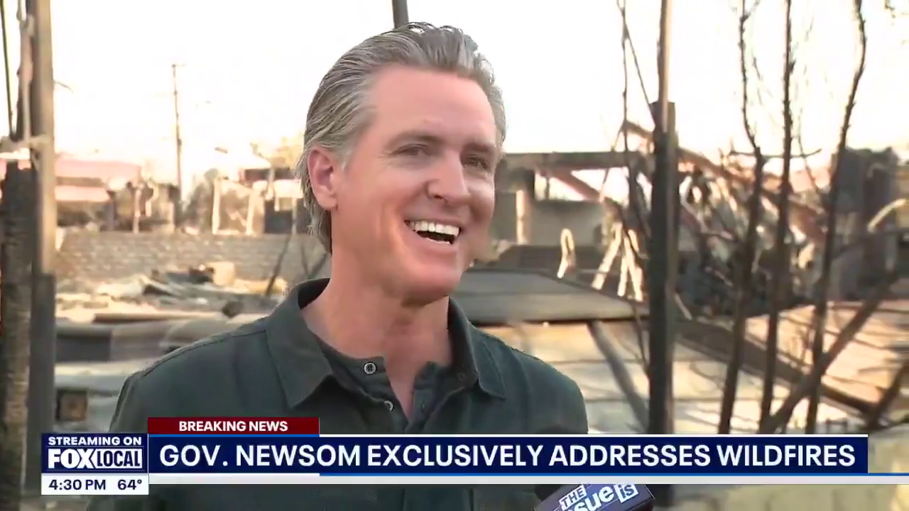 Gavin Newsom Smiles And Dances In Front Of The Burned Out Ruins... WE HAVE LAND SPECULATORS ON THE WAY!