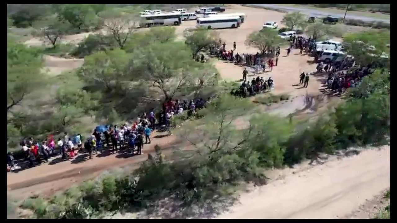 Bill Melugin: drone video of the massive single group of migrants that just crossed illegally into Eagle Pass, TX.
