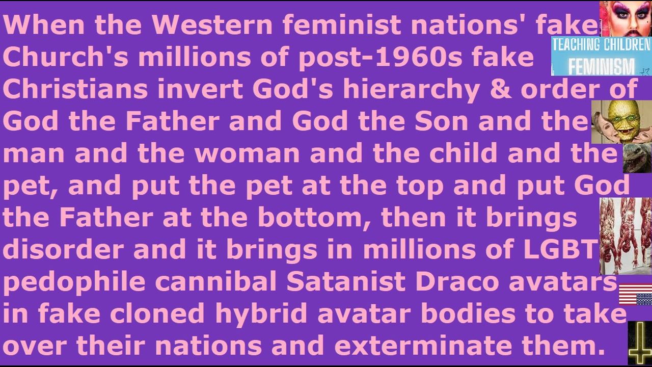 *** Intelligence news update from the Human Homo-Sapiens Race Survival Resistance (HRSR) headquarters and Republic Rebel Alliance battlefront (September 2024). When the Western feminist nations’ Church’s millions of post-1960s fake Christians redefine hundreds of Bible verses concerning men and women and women's head coverings protection and warnings against cross-dressing in men's pants, and reverse God’s hierarchy and order of God the Father and God the Son and man and woman and child and pet and reverse it into an inverted satanic hierarchy starting with the pet and the child and the woman and the man and Christ and Father God, then it brings disorder and it brings millions of Draco reptilian chimera fake alien incarnate avatar pedophile cannibal Satanist globalist elites to take over every aspect of their Western feminist nations’ governments and schools and media and corporations and churches and military and police, and the millions of fake Christians get exterminated by these demon spirits disguised as humans in cloned hybrid human avatar bodies using sword & famine & plague & demon armies judgment. Once we real Christians are gone, then the fake Church’s millions of fake Christians will get killed by Satan Lucifer and his Illuminati NWO one-world global government.
