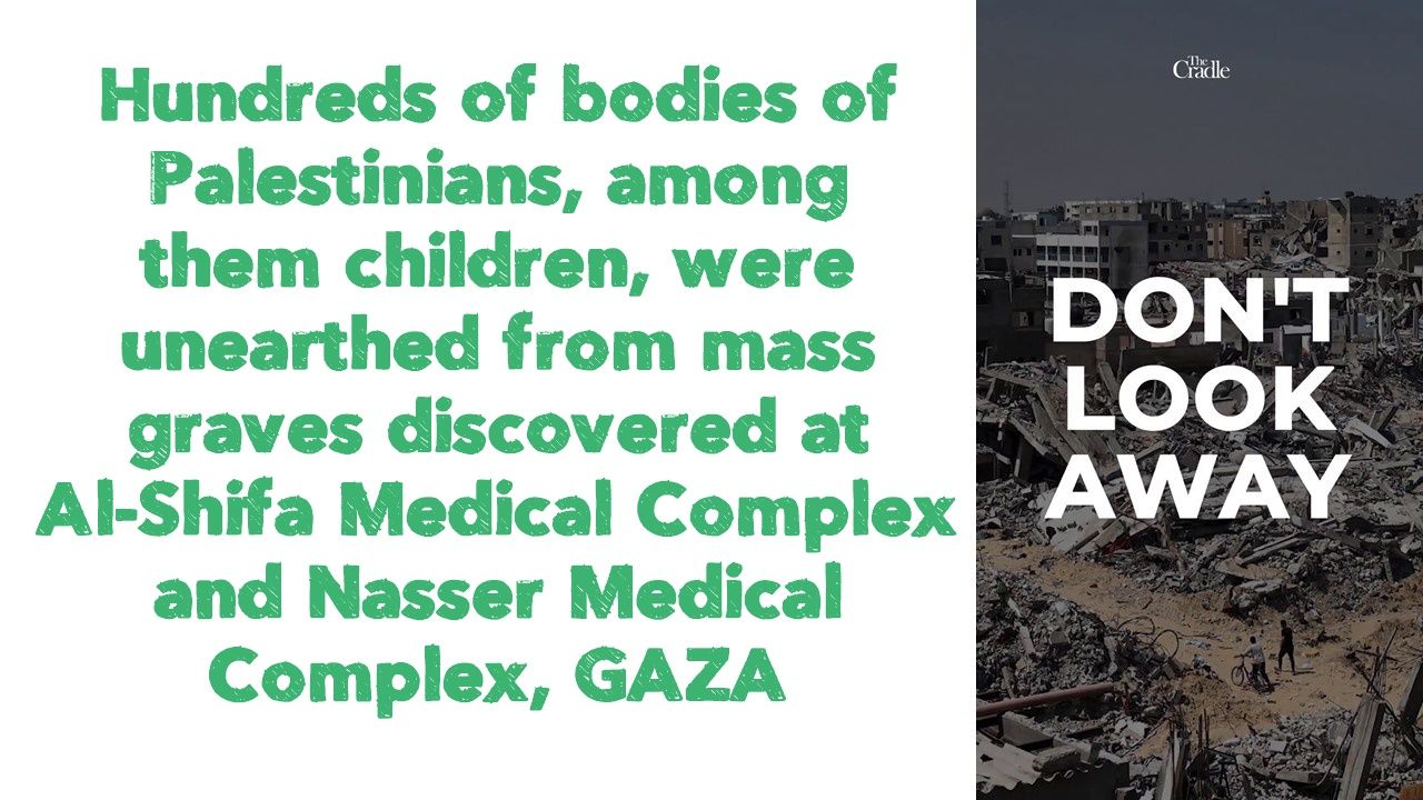 Hundreds of bodies of Palestinians, among them children, were unearthed from mass graves discovered at Al-Shifa Medical Complex and Nasser Medical Complex in the Gaza Strip, where victims were executed and buried alive. Some were found mutilated, skinned, and beheaded, while other corpses showed signs of organ removal. The discoveries offer only one small glimpse of the unspeakable crimes committed by Israel in Gaza.