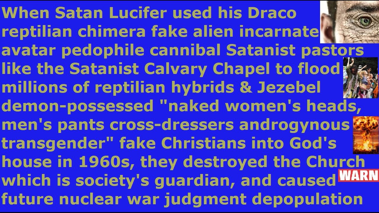 *** Intelligence news update from the Human Homo-Sapiens Race Survival Resistance (HRSR) headquarters and Republic Rebel Alliance battlefront (May 2024). Pastor J. Vernon McGee exposes how Satan Lucifer’s millions of 1960s Draco reptilian chimera incarnate avatar pedophile cannibal Satanist New Age occult esoteric spiritualism spirit guide channeling witchcraft female rebellion Jezebel demon spirit’s reptilian hybrids and “Jezebel demon-possessed” hippy fake Christians flooded the millions of churches in the Western feminist nations, and made the human women throw off their women’s head coverings to have their heads controlled by the fallen angels, and made the human women cross-dress in men’s pants to mock God’s Word, which started the degradation of the Western feminist nations’ churches that is supposed to be the spiritual guardians of any civilization. God holds the Church responsible for the corruption of society and not the heathens. This is why Satan Lucifer corrupted the Church first. The Western feminist nations’ most wicked dumbest blindest perverted 1960s generation since Noah’s Atlantis flood days “Bible verses redefining, uncovered women’s heads, fallen angel head controlled, men’s pants cross-dressers androgynous transgender, covered men’s heads, God-mockers” fake Christians and their children & grandchildren, whose Draco reptilian chimera fake alien incarnate avatar pedophile cannibal Satanist pastors like the Calvary Chapel Satanist organization’s Chuck Smith redefined hundreds of Bible verses to replace Jesus with hundreds of fake foreign gods, are still cheering on the same Antichrist spirit’s Draco avatar pedophile cannibal Satanist Donald Trump, just like they did with the Draco avatar pedophile cannibal Satanist “Beetles” rock band back in the 1960s. They do not change, because they are demon-possessed by the Jezebel demon spirit. They will get killed by sword & famine & plague & demon army judgment. The Draco reptilian chimera fake alien incarnate avatar globalist elites’ “Ordo Templis Orientis falling dove symbol” Satanist churches like Calvary Chapel and all their pedophile cannibal Satanist pastors like Chuck Smith brought in the Jezebel demon spirit and its satanic Christian worship music and Satanist Western culture and hundreds of redefined Bible verses to destroy Western Christianity and mislead billions of fake Christians to hell, during the 1960s feminist witchcraft rebellion. When the Western feminist nations’ 2 billion fake Christians rebel against women’s head coverings and cross-dress in men’s pants to mock God & his Word and replace Jesus with their Jezebel demon spirit goddess & hundreds of other foreign fake gods, then they invite millions of reptilian hybrid demon spirit incarnate avatar Satanists to take over their nations and to ban the Bible and exterminate the fake Christians with nuclear war. Preach this in your next Sunday church service sermon, so that 99% of your church donators will leave your church in anger & terror & disgust, so that God’s house will be cleansed of their religious filth. Do it now and do not wait until tomorrow, unless you are a crazy lunatic who has lost all common sense of the Holy Spirit. Jesus died on the cross to atone for your sins, and he rose again, and he is seated on his throne in heaven reigning, so that whoever repents and receives him as Savior & Lord will receive forgiveness for sins and the gift of eternal life. Salvation is by free grace and faith in the atoning blood of Jesus, and not by wearing women's head coverings or abstaining from cross-dressing in men's pants or abstaining from extorting fake illegal tithe income tax.