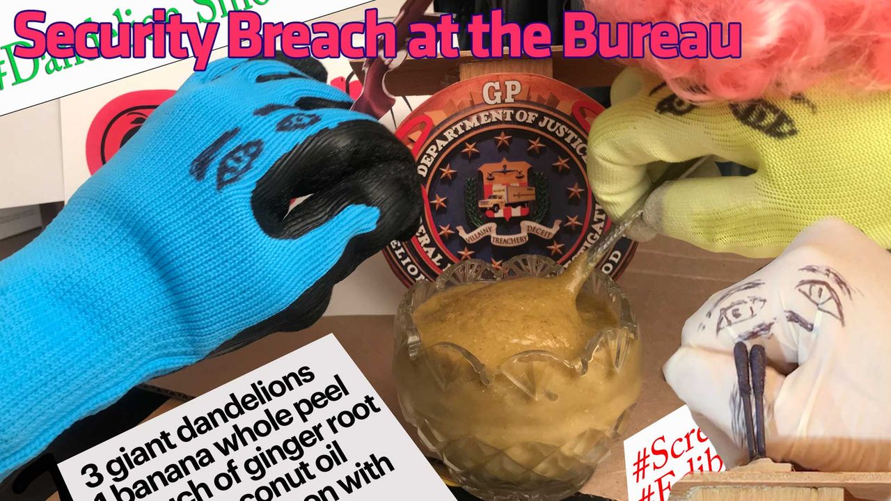 The Chief is super pissed that someone breached the security at the fortress that is the headquarters to the bureau, coming into the staging area where he conducts his press conferences, then posed for selfies with a ginormous crystal bowl filled with a dandelion smoothie, which posts then went viral all over Twitter. Additional to the smoothie at hand, were signs reading "Vive la résistance" and "Dandelion Smoothies Rule," along with a recipe, and other placards making fun of the bureau chief, an act of defiance to his authority and messaging of this last week with his crackdown on dangerous misinformation, which is, the idea that smoothies are a food source.