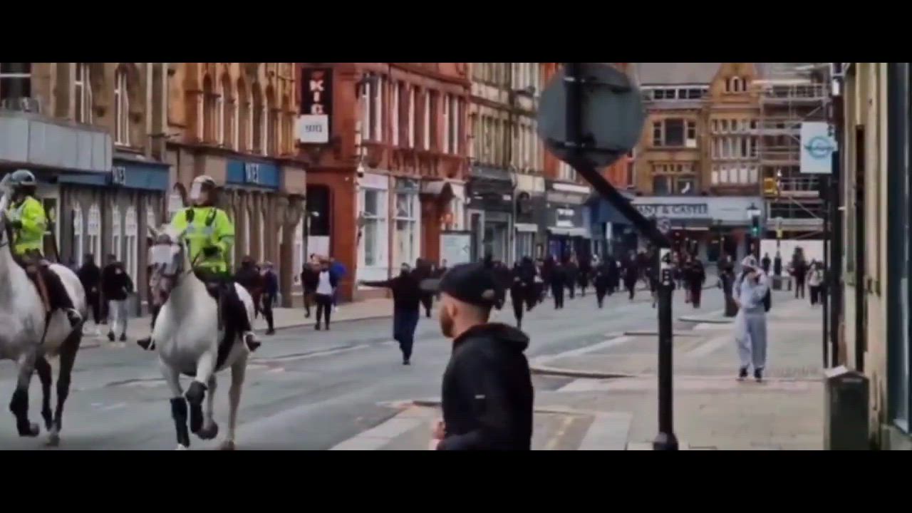Britain - far-right running first, bobbies on horse and the what appears to be black covered aggressive Antifa types following them?🤷‍♂️