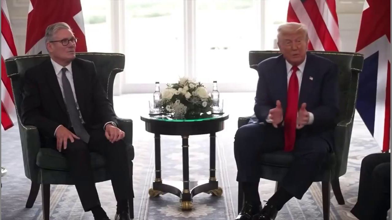 Donald Trump discusses getting rid of the estate {inheritance} tax on family farms in the USA because of the financial and mental health impact on farmers. Keir Starmer awkwardly looks on in silence.