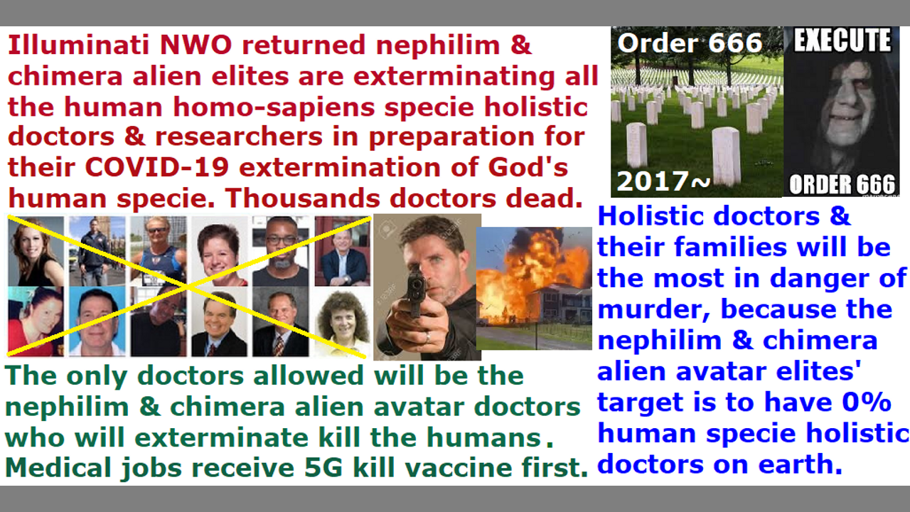 *** Intelligence news update from the Human Homo-Sapiens Race Survival Resistance (HRSR) headquarters and Republic Rebel Alliance battlefront (January 2021). Thousands of holistic and homeopathic and natural remedies doctors and researchers have been exterminated by the Illuminati NWO Nazi 5th Reich AntiChrist one-world government already, and millions more are scheduled to be killed by fast kill gunshots and car accidents and suffocations and psychic attacks and witchcraft spirits and poisons and heart attacks and strangling and forced suicides and hangings and falling off and electrocutions and abductions and rapes and organ harvestings and slaveries and Satanist human sacrifice orgy rituals, and millions of their families are being slowly exterminated with CIA microwave oven weapons from next door homes and vans, and FBI pinpoint heart attack weapons, and arsenic refrigerator food poisonings, and Umbrella corporation biochemical weapons, and 5G fast-growing cancer frequencies, and so on and so forth. If they go to the hospitals, they will be killed by either arteries cut, or put on ventilators, or suffocation by own blood, or other methods. Depopulation agenda by the 33.3% of earth’s population of nephilim & chimera alien incarnate avatars for the humans is 99% of God’s human homo-sapiens specie populace, and 1% to be either a cloned androgynous child sex slave specie or a human meat livestock specie or a COVID-19 AI femtobot hive-mind Borg zombie vaccine LGBTPB (Lesbian Gay Bisexual Transvestite Pedophile Bestiality) satanic ritual human sacrifice sex slaves. Satan Lucifer’s fallen angels’ 6,000 year old Atlantis Umbrella company injects a Naga gene that codes the Nagalase enzyme to all their hated God YHWH Jesus’ human homo-sapiens specie babies at birth using vaccines. Vaccines are fake science. The Nagalase stops the body’s natural immune system’s GcMAF which protects the human from all of Satan Lucifer’s Atlantis Draco diseases like cancer and HIV AIDS and tumors and all other manufactured diseases. The Naga and Draco reptilian chimera alien incarnate avatar globalist elites and their pharmaceutical witchcraft alchemy and medical witchdoctors would no longer be able to make billions of dollars if God’s natural human immune system was allowed to work. Some of the holistic doctors being murdered were using these cures, as well as other natural cures using the human body’s immune system. Satan Lucifer’s Illuminati NWO is moving quickly to not only cook alive us real Christians with CIA microwave oven weapons from downstairs rooms, who are boldly speaking out 100% of the physical and spiritual background truths, but they are also moving forward at the Draco avatar Donald Trump’s “Operation Warp Speed” Nazi SS blitzkrieg attack to exterminate the humans or make them into Borg AI femtobot COVID-19 vaccine child sex slaves or human meat livestock slaves.