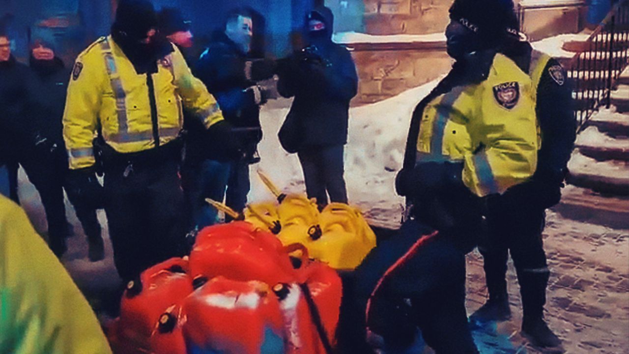 Police Officers Steal Fuel From Freedom Convoy Protesters