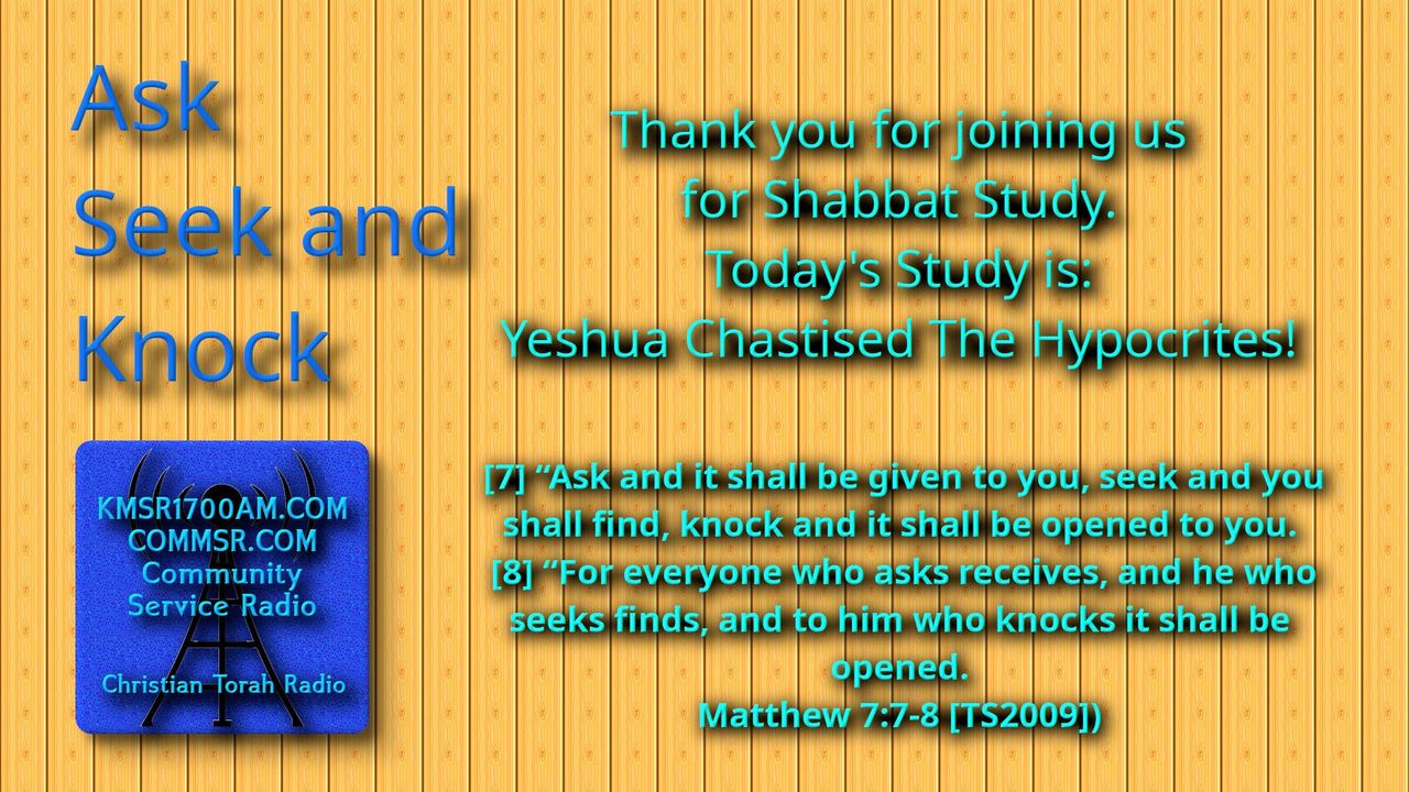 Thank you for joining us with kmsr1700am.com for another Ask Seek and Knock Teaching as we discuss the topic “Yeshua Chastens Hypocrites”. What does the Scripture tell us about this topic? Grab your Scriptures and Highlighters, and Let’s Get Started. Please share it with your friends and if you liked it, give it a Like on whatever platform you are watching this on.