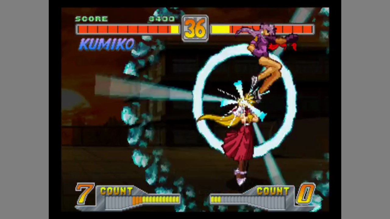 There are nine characters to choose from. You have three buttons for punches, three buttons for kicks, one for provoking and one for "Sonic Shift". Apart from 2-player mode, the game has a training mode with configurable CPU, a story mode and a survival mode. In survival mode, you play one-rounded matches until you're game over.