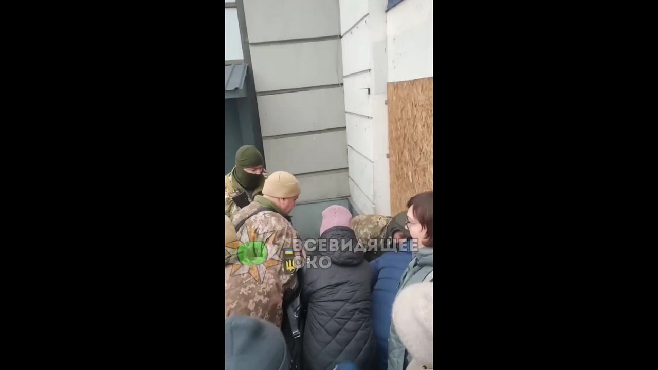 A TCC employee, threatening with a loaded machine gun, tries to disperse a crowd protecting a beaten man from mobilization.