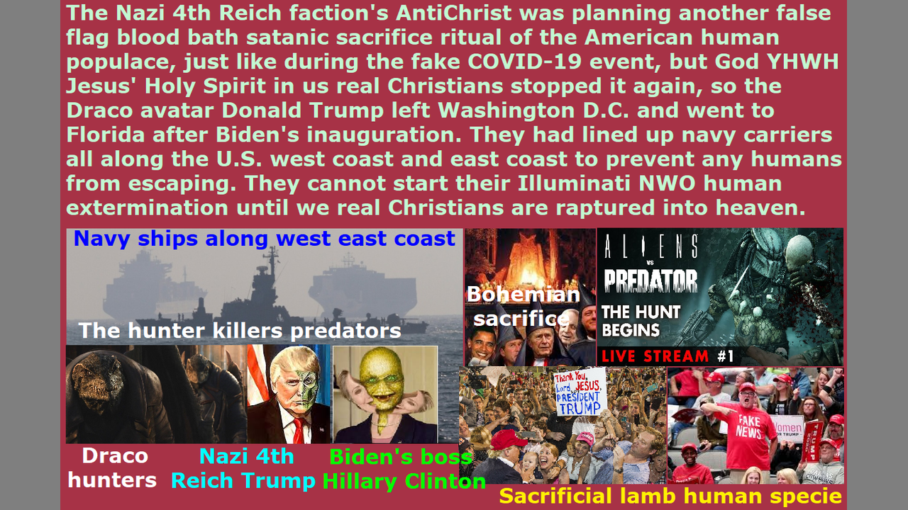 *** Intelligence news update from the Human Homo-Sapiens Race Survival Resistance (HRSR) headquarters and Republic Rebel Alliance battlefront (January 2021). The AntiChrist tried to take the AntiChrist job again, and tried to start a blood bath Satanist sacrifice of the American people, but God’s Holy Spirit inside us real Christians stopped it again. All the millions and millions of “women’s head coverings rebelling” “Satan Lucifer’s 1840s to 2020s cross-dress-project men’s trousers wearing” “Bible-redefining” religious Christian convert hordes are extremely angry at God’s real Christians for stopping their “Post Pan Pre-Wrath Tribulation Rapture Theories lies AntiChrist fake millennial kingdom of Christ’s” AntiChrist from taking power, and they are very disappointed. Even the most dumbest sinful human populace from the liberal states like California and Hawaii have flipped from the communist Satanist shapeshifting Draco reptilian chimera alien faction to the Nazi SS “Black Sun” Satanist cybernetic Draco reptilian chimera alien faction’s “Alliance of Planets,” and are now completely supporting and cheering on the AntiChrist. These religious Christians are ready to stone us real Christians and Jesus for stopping their AntiChrist from taking power, and starting the blood bath satanic sacrifice of them and their families, and the starting of their Illuminati NWO one-world government Nazi 4th Reich. Just like during the fake COVID-19 event, they were planning another blood bath sacrifice of all the American human homo-sapiens specie populace, and had sealed off both the west coast and east coast with hundreds of U.S. Navy aircraft carriers and naval ships to prevent any humans from escaping. But again, God’s Holy Spirit in us real Christians stopped their satanic ritual sacrifice of the American people and the Western feminist nations’ dumb sinful “Bible verses redefining” “women’s head coverings rebelling” “men’s trousers cross-dressing” human populace and religious Christians. Britain had already spread their COVID-21 biochemical weapon that they had created long time ago, and had sealed off their nation to exterminate all these feminist human homo-sapiens specie “women’s equality” people and religious Christian Jezebel worshippers, but they could not, because God’s Holy Spirit in us real Christian stopped the devil Satan Lucifer and his Illuminati NWO world takeover. They cannot start their Illuminati NWO revived Atlantis returned nephilim & chimera alien incarnate avatars’ (now 33.3% of the earth’s population) world takeover and extermination of the humans, until we real Christian Church Saints “Bride of Christ” are raptured up into heaven. We real Christians have to finish our warning to repent, and then Noah’s ark door will close, and then we real Christians will get raptured, and then Satan Lucifer and his Illuminati NWO can create their blood bath and human extermination depopulation. Repent and receive Jesus as Savior, and make straight the path of the Lord! End of transmission…
