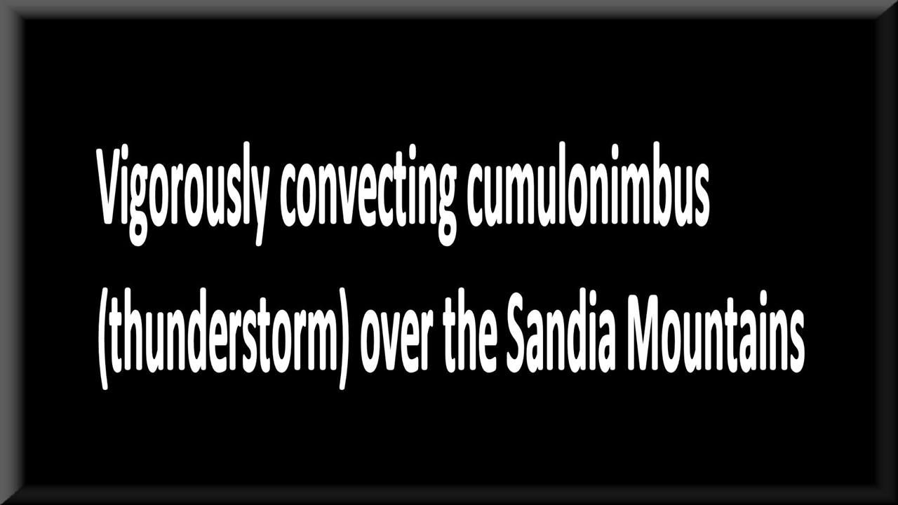 Vigorous deep convection over the Sandia Mountains starts off as cumulus congestus, then grows into cumulonimbus calvus and eventually becomes cumulonimbus incus. Some pileus here and there all of which are being superheated by microwave energy to disable precipitation from this cloud formation