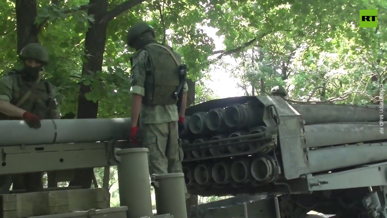 The Russian MoD shares footage of the combat work of the crew of the Uragan self-propelled 220mm multiple rocket launcher on the battlefield