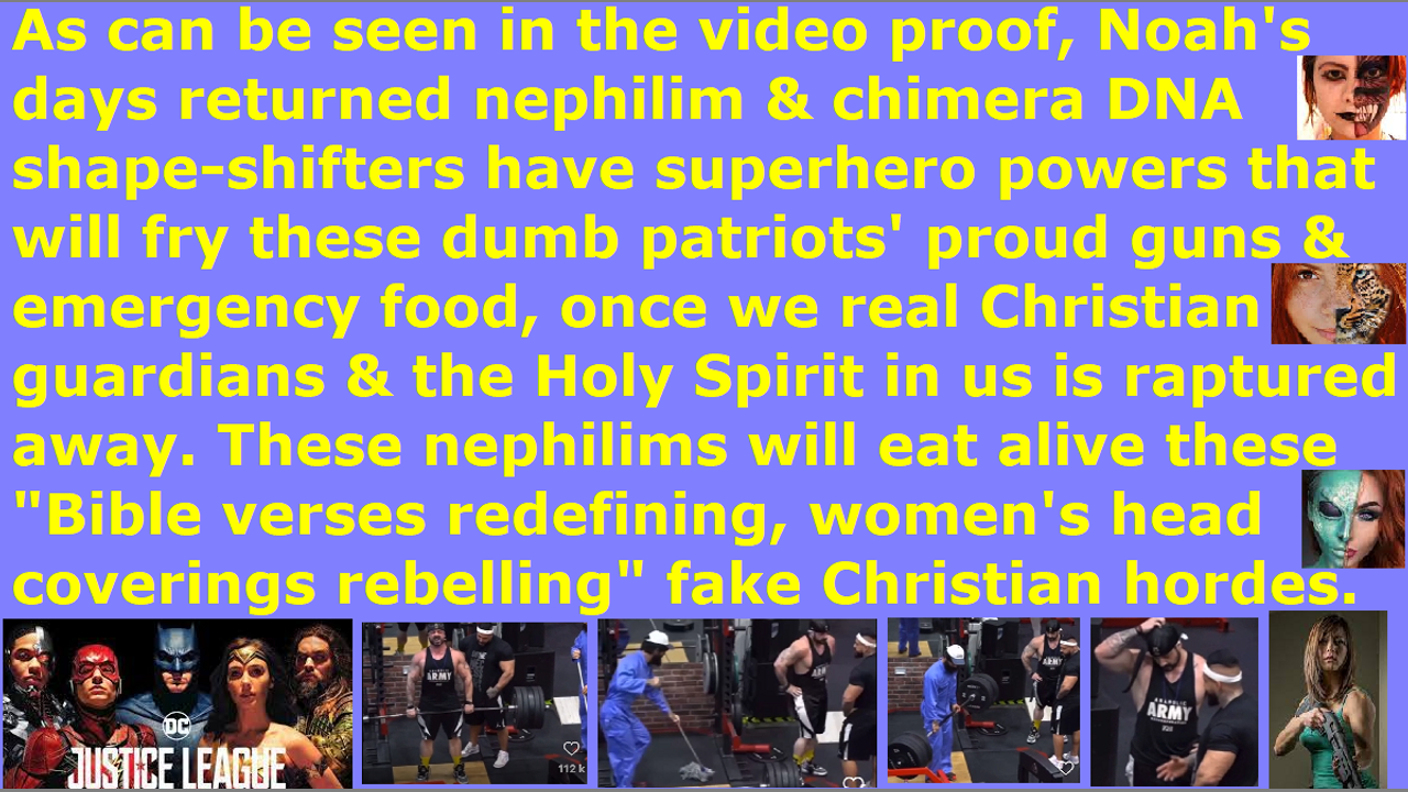 *** Intelligence news update from the Human Homo-Sapiens Race Survival Resistance (HRSR) headquarters and Republic Rebel Alliance battlefront (May 2023). As can be seen in the video proof, Noah's days returned nephilim & chimera DNA shape-shifters have superhero powers that will fry these dumb patriots' proud guns & emergency food, once we real Christian guardians & the Holy Spirit in us are raptured up to heaven. These nephilims will destroy these "Bible verses redefining, women's head coverings rebelling, fallen angel head controlled" “Satan Lucifer’s post-1960s cross-dress-project men’s pants wearing” Western feminist nations’ fake Christian prepper rebel idolaters. They take pride in their guns and own power, but they redefine hundreds of Bible verses to worship hundreds of fake foreign gods and bring judgment upon themselves. These are fake Christian idolaters who worship self. They run around with naked women’s heads to rebel against God, and they run around cross-dressing in men’s pants to mock God, and they believe they can fight against God’s judgment and destroy these nephilims & chimeras & fallen angels with their guns and nationalism and emergency food. This is the most stupidest most wicked post-1960s hippy’s grandchildren generation that has ever existed, and who were prophesied in the Bible to appear in the End Times. They are also the most clownish and hilarious group of people in history and the fallen angels laugh at them, because they walk around with naked women’s heads and naked men’s penis, and walk around cross-dressing in men’s pants and women’s dresses in church. They have no common sense of the Holy Spirit, although they claim to be Christians. Preach this in your next Sunday church service sermon, so that 99% of your church donators will leave your church in anger & disgust & terror, so that God’s house will be cleansed of their religious filth. Jesus gave his life for you on the cross naked without a toilet, and rose again and is seated on his throne in heaven, so that whoever repents and receives him as Lord & Savior will receive forgiveness for sins and the gift of eternal life. Get rid of the hundreds of fake foreign gods of the hundreds of redefined Bible verses, and restore Jesus and his original Bible verses back to the Church. God’s real Christians true Church and the Western feminist nations’ Satan Lucifer’s harlot Church’s “naked women’s heads, men’s pants cross-dressers” religious Christian hordes are two different groups. They will make a big mistake when they take God’s real army for Satan Lucifer’s fake army posing as God’s army. The Western feminist nations’ fake harlot Church and fake pastors and fake Christians hide all these infiltrated nephilims & chimeras fake aliens incarnate avatars inside their churches, because of the fear of assassination attempts and ridicule from church donators. We real Christian samurai warriors expose them, so they try to kill us, and every single pastor and tens of thousands of religious Christian hordes run away from us for fear of getting targeted by CIA microwave oven weapons cooking alive from next door homes & rooms, also. The fake Christians do not expose the evil, but they cover it up and condone it and support Satan Lucifer in his agenda as coconspirators. This is the difference between a real Christian who is receiving constant assassination attempts and ridicule from church donators, and a fake Christian who has no assassination attempts and are loved by their church donators. Repent and receive Jesus as Savior, and make straight the way of the Lord! They do not like my daily sermon I am writing right now, so they are attacking with deep sleepiness attacks and tears and runny nose. End of transmission…