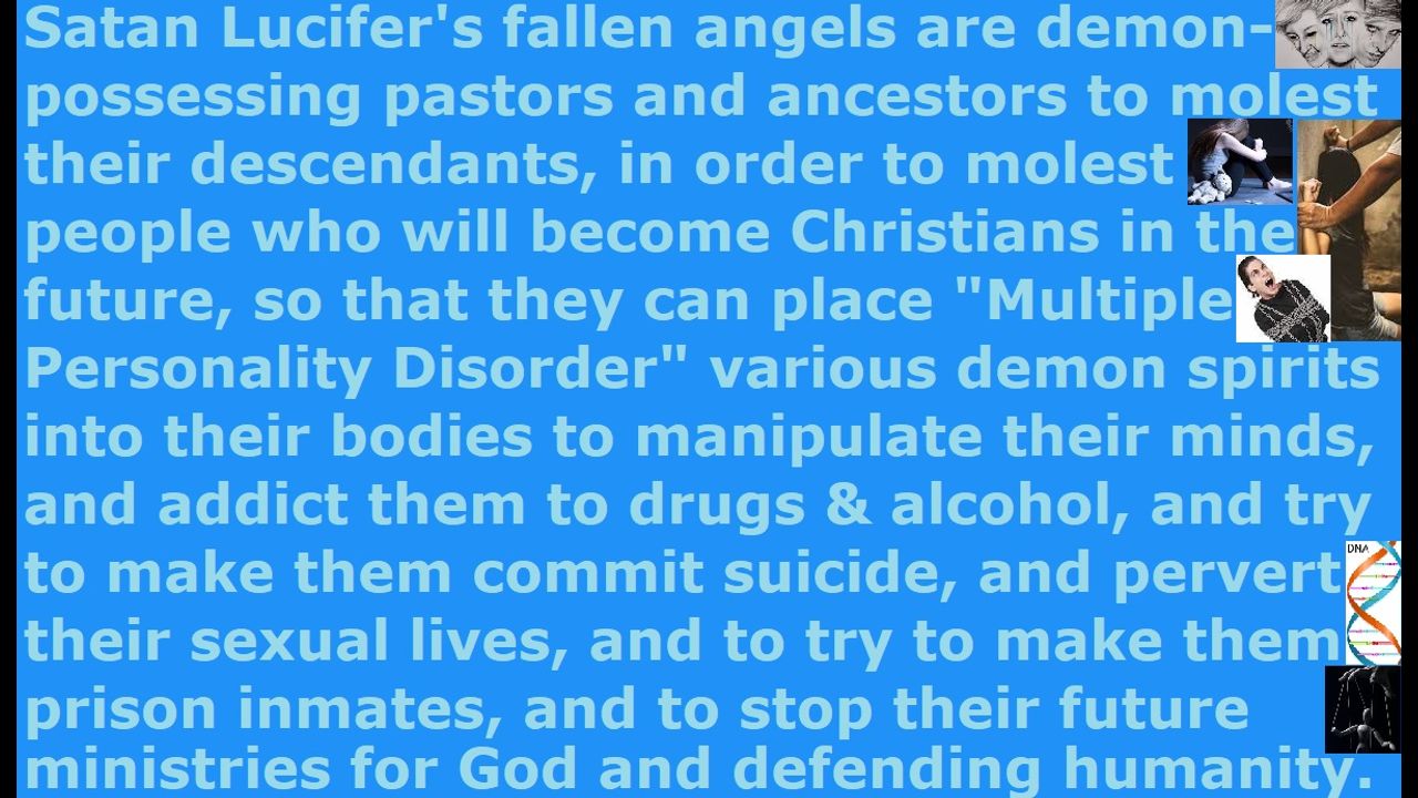 *** Intelligence news update from the Human Homo-Sapiens Race Survival Resistance (HRSR) headquarters and Republic Rebel Alliance battlefront (May 2025). Satan Lucifer's fallen angels are demon-possessing pastors and ancestors to molest their descendants, in order to molest people who will become Christians in the future, so that they can place "Multiple Personality Disorder" various demon spirits into their bodies to manipulate their minds, and addict them to drugs & alcohol, and try to make them commit suicide, and pervert their sexual lives, and to try to make them prison inmates, and to stop their future ministries for God and stop their defending of humanity. 1 John 5:18 “We know that everyone who has been born of God does not keep on sinning, but he who was begotten of God protects him, and the evil one does not touch him.” Isaiah 49:25-26 says, “But this is what YHWH says: ‘Yes, captives will be taken from warriors, and plunder retrieved from the fierce; will contend with those who contend with you, and your children I will save. I will make your oppressors eat their own flesh; they will be drunk on their own blood, as with wine. Then all mankind will know that I, YHWH, am your Savior, your Redeemer, the Mighty One of Jacob.’” Psalm 91:1-8 says, “Whoever dwells in the shelter of the Most High will rest in the shadow of the Almighty. I will say of YHWH, ‘He is my refuge and my fortress, my God, in whom I trust.’ Surely he will save you from the fowler’s snare and from the deadly pestilence. He will cover you with his feathers, and under his wings you will find refuge; his faithfulness will be your shield and rampart. You will not fear the terror of night, nor the arrow that flies by day, nor the pestilence that stalks in the darkness, nor the plague that destroys at midday. A thousand may fall at your side, ten thousand at your right hand, but it will not come near you. You will only observe with your eyes and see the punishment of the wicked.”