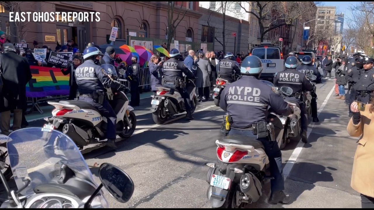 3/19/23: Drag Queen Story Hour hosted by NY Attorney General Letitia James at The Center in the West Village in Manhattan. Protesters, counter protesters, proud boys, antifa and NYPD face off outside.