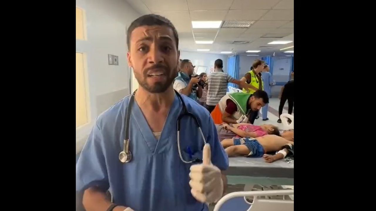 This was posted earlier today, 17th Oct, UPDATE: this same doctor from an another video that I posted next day, today 10/18, so this appears to be the same hospital that was hit by an Israeli missile hit tonight, at 22:30 GMT, 17 October. Thank goodness that he survived without harm.