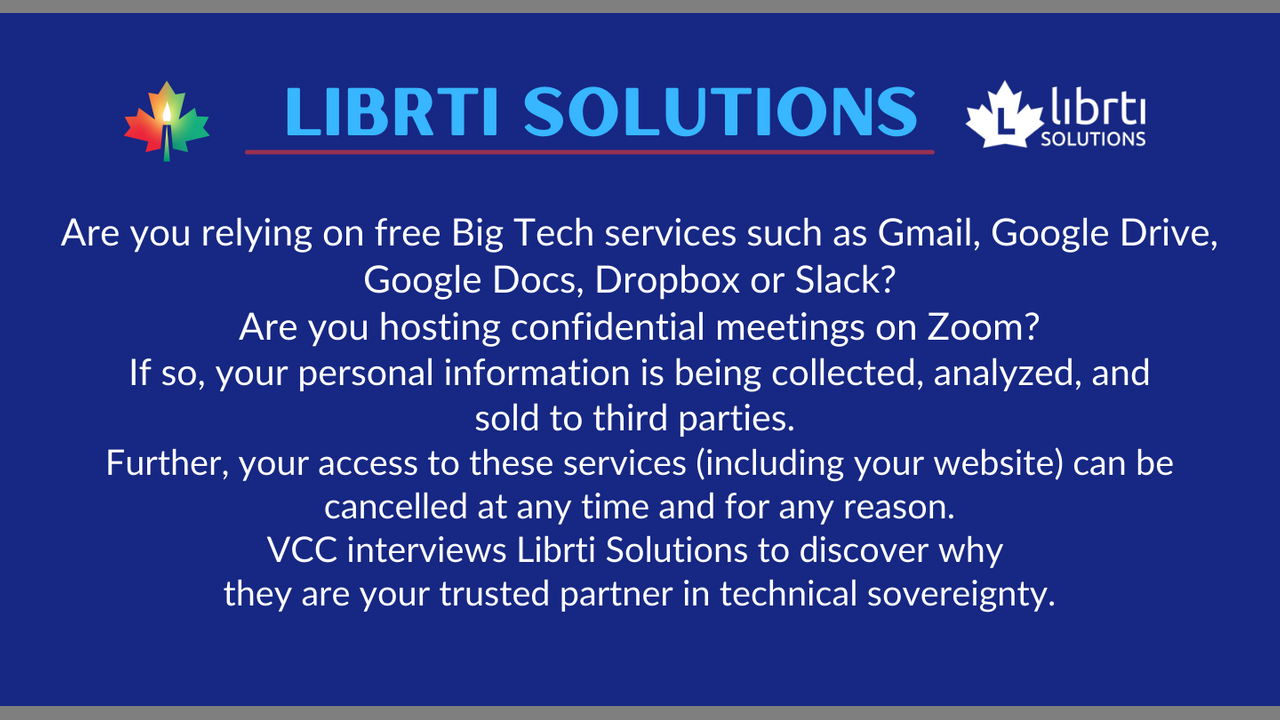 If so, your personal information is being collected, analyzed and sold to third parties. Your access to these services (including your website) can be cancelled at any time and for any reason. VCC recently interviewed Librti Solutions to discover why they are your trusted partner in technical sovereignty.