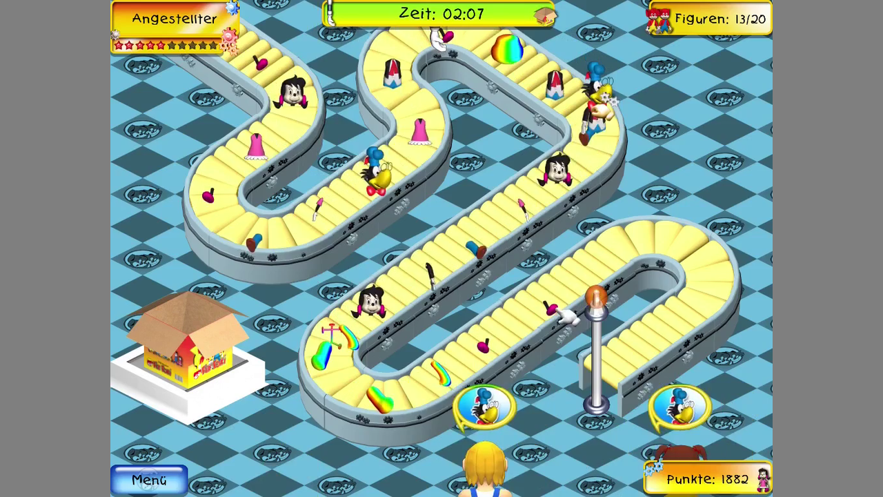 A level consists of a single screen with one or more conveyor belts on it. Parts for the dolls will transported on the conveyor belts, and you will loose once parts have reached the end of a conveyor belt and stay there for too long. You assemble parts by clicking consecutively on several parts. They will stick together automatically unless one part is a double. Once a doll is finished, it will be removed from the belt. Each doll has its own set of parts, but there are also rainbow coloured parts which be used on any doll. At the bottom of the screen, customers are waiting. They want a specific doll. It will automatically be given to them once you have assembled it, but they will leave if they have to wait for too long. the more unsatisfied customers you have, the lower the rating for the level. There are also some bonus items appearing. Yarn can be used to complete a doll immediately, while halves of sprockets can be combined for an effect, like reversing the belts or slowing them down.