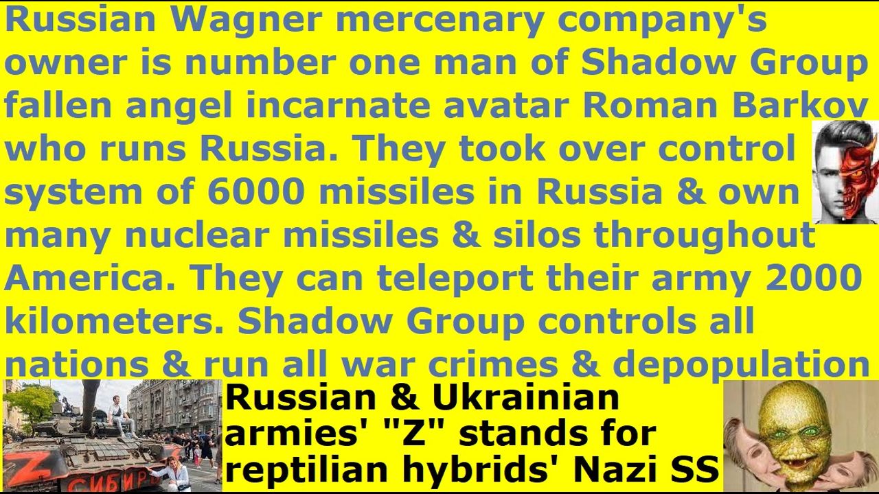 *** Intelligence news update from the Human Homo-Sapiens Race Survival Resistance (HRSR) headquarters and Republic Rebel Alliance battlefront (June 2023). Steven BenNun is deceiving everyone again by saying that the Wagner company is crazy to attack the Russian nation and Russian military, and to say that they will destroy Russia and its air force and army and navy. He says he does not know why Russia does not punish the Wagner company for this treasonous act and mutiny. The Russian Wagner mercenary company is controlled by the “Shadow Group” fallen angels. The “Shadow Group” fallen angels also control the Western feminist nations, too. The fallen angels are running the fake wars. The fallen angel incarnate avatar Roman Barkov of the Russian intelligence runs Russia. The owner of the Wagner Group company Yevgeny Prigozhin is the number one man of Roman Barkov. Barkov told Prigozhin that if he wants to be the president of Russia, then he can go ahead and take over Russia, and Barkov will support him. The fallen angel incarnate avatars in each nations’ intelligence agencies commands the presidents and prime ministers, including this disinformation cover-up CIA agent Steven BenNun, who hides the real truth and misleads people into believing that NATO runs the Russian Wagner mercenary army. Steven BenNun just says that he is a Christian and mentions the NWO ever-so-often, but at the same time, he perverts the Bible and doctrines on purpose to mislead his listeners and makes his listeners believe that NATO is fighting Russia to create that national conflict mentality. Either he is dumb beyond belief that he does not realize his hypocrisy and double-tongue or he is an occultist Satanist demon-possessed by Satan Lucifer. I believe his facade talk is to lure dumb religious Christian hordes in to listen to him and pay donations to him, but his real occultist Satanist purpose is to indoctrinate with his deceptions and lies. The Wagner company owns many nuclear missiles and nuclear missile silos throughout America, including Wisconsin and Alaska and Nebraska. The fallen angels can start their nuclear war anytime, as soon as we real Christians finish our warnings and are raptured up to heaven. We real Christians and the Holy Spirit in us restrains the spirit of the AntiChrist. The Wagner company’s soldiers and vehicles can teleport instantly between 1300 to 1600 kilometers to another location. When it goes close to 2000 kilometers, some of the sensitive equipment may have problems, so they need to fix them. The Wagner company is located all over the world, including America and Russia. They have close ties with the Nazi 4th Reich space fleet’s Blackwater company Nazi SS army, which runs the Ukrainian military. The Wagner Group company has taken over the control system of 6,000 missiles in Russia, and Russia no longer controls them. We real Christians told Satan Lucifer’s fake pastors to inform and warn their church donators that 70% of their Western feminist nations’ “women’s head coverings rebelling, fallen angel head controlled, men’s pants cross-dressing, women’s dress cross-dressing drag queen transvestite” military and police are infiltrated Nazi 5th Reich space fleet’s androids and cybernetic androids, but they still remain silent and condone it and keep God’s spiritual army blind and cover-up Satan Lucifer and are accomplices with this fake human army that will exterminate them and their church donators. This is treachery at an extreme level by these Satan Lucifer’s “ordained & allowed & trained & non-assassination-attempts-receiving” fake pastors and religious Christian hordes. Basically, these Satan Lucifer’s pastors are supporting Satan Lucifer’s nuclear war and condoning it by their silence by covering up these fallen angel criminals. It is not only a treachery at the political level but also at the church level.