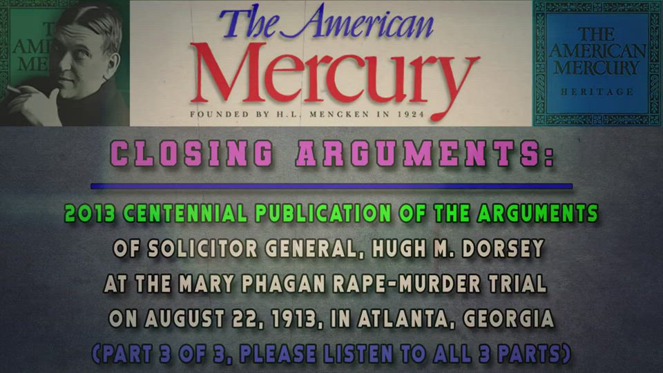 The Third Part of the Closing Arguments By Solicitor Dorsey Continues With Frank being accused of trying to bribe Jim Conley to burn her body and cover up for him. Jim cautiously rejects his offer saying that the risks and troubles are not worth it if he gets caught in the act. This was very likely since smoke would eject from the chimney and into the sky thereby implicating him directly in the crime. Frank even tries to deflect suspicion off him and cast it upon Gantt when he sends the telegram to his uncle laying the blame on Gantt. Earlier Frank had claimed that he didn't know Mary Phagan but the message to his uncle proved otherwise.