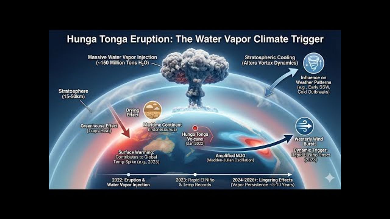 Imagine a single volcanic eruption in 2022 pumping 14% more moisture into our atmosphere overnight The Hunga Tonga blast wasn't your typical ash-spewing monster like Tambora in 1816, it unleashed a water vapor canopy that's been reshaping weather patterns worldwide, from shrink-wrapped cyclones to blocked winds causing mega El Niños. Now, as this vapor finally rains out, we're entering a chaotic "snapback" phase in 2026 and beyond.