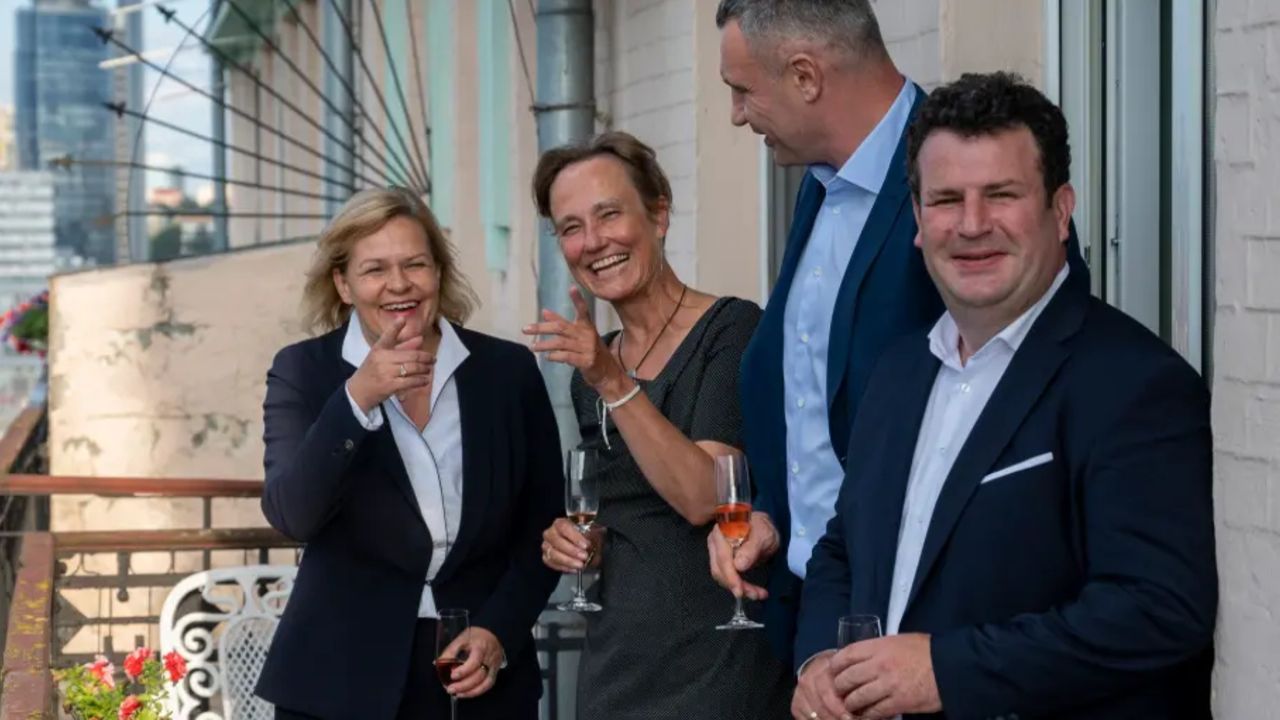 Ποικίλες αντιδράσεις και δυσμενή σχόλια έχει προκαλέσει στα κοινωνικά δίκτυα μια φωτογραφία που «τραβήχτηκε» στο Κίεβο και δείχνει την Υπουργό Εσωτερικών της Γερμανίας Νάνσι Φέζερ, τον Υπουργό Εργασίας Χουμπέρτους Χάιλ (SPD), τη γερμανίδα πρεσβευτή στο Κίεβο ‘Ανκα Φελντχούζεν και τον δήμαρχο της ουκρανικής πρωτεύουσας, Βιτάλι Κλίτσκο, να είναι μέσα …στην τρελή χαρά. Οι συνειρμοί με την κατάσταση που βρίσκεται η Ουκρανία και τον πόλεμο είναι βέβαια αναπόφευκτοι όπως μπορεί να αντιληφθεί κανείς. Όλοι τους κρατούν ένα ποτήρι, σαν να γιορτάζουν κάτι σημαντικό.