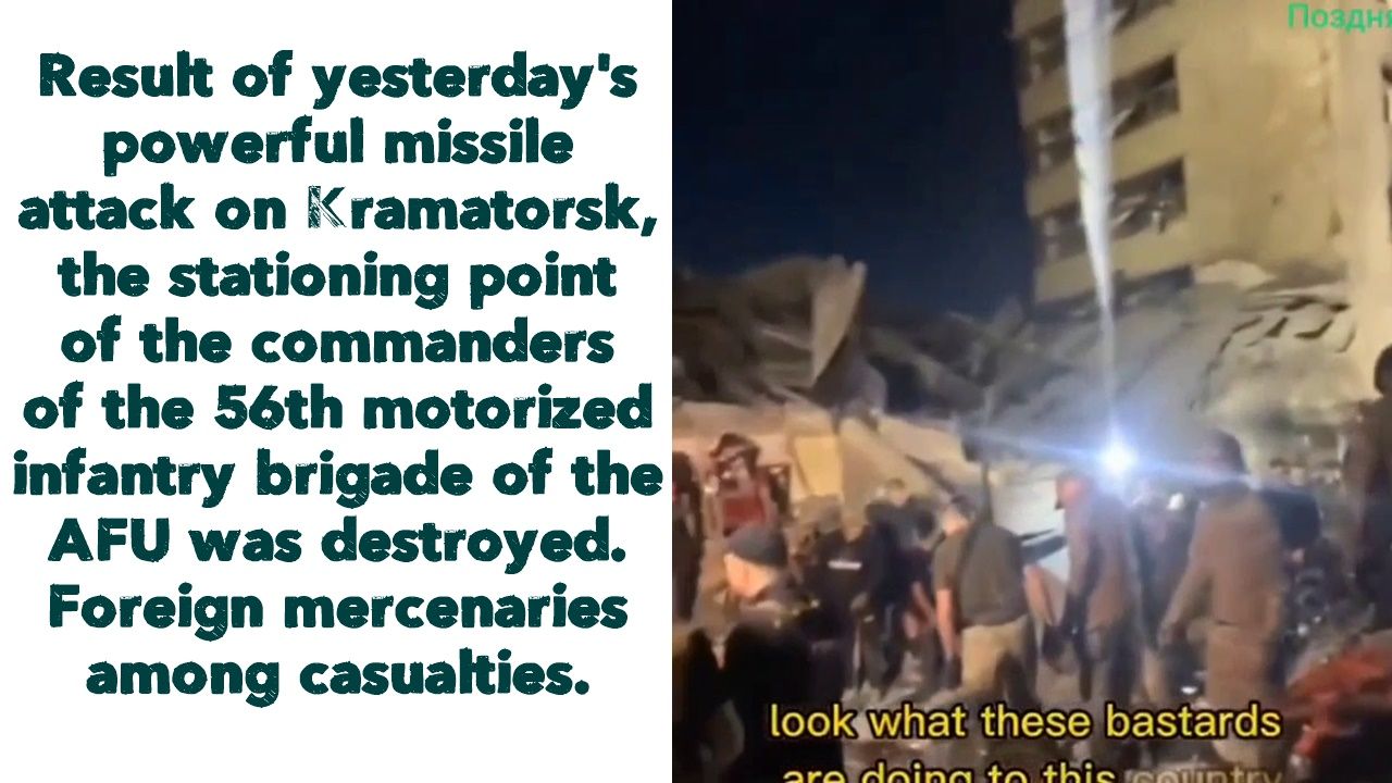 🇷🇺🇺🇦⚡️The Ministry of Defense of the Russian Federation reported that as a result of yesterday's powerful missile attack on Kramatorsk, the stationing point of the commanders of the 56th motorized infantry brigade of the Armed Forces of Ukraine was destroyed. According to various reports from the field, several dozen officers died + an unspecified number of foreign mercenaries.